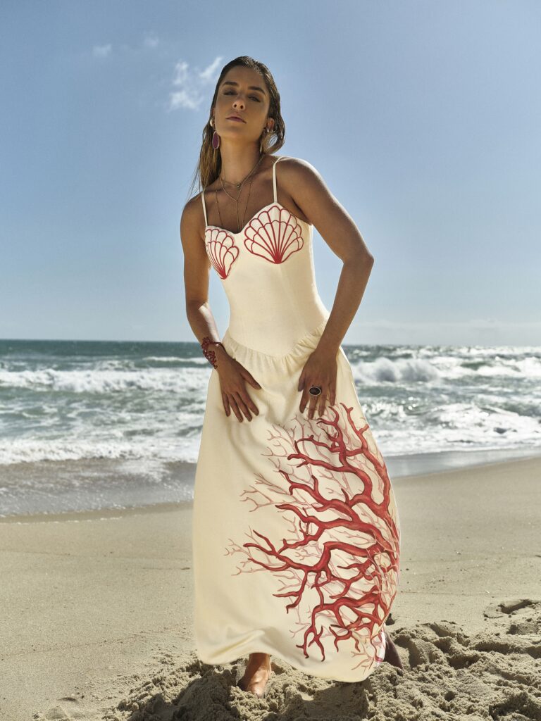 Elementos marítimos surgem como assinatura da coleção. Lagostas, peixes, conchas e referências ao universo do mar aparecem em bordados e estampas desenvolvidas com exclusividade, ao lado de corais e listras que evocam o movimento das ondas. “Esses símbolos reforçam a identidade da coleção e criam uma conexão direta com o imaginário do verão”, pontua Carolina.