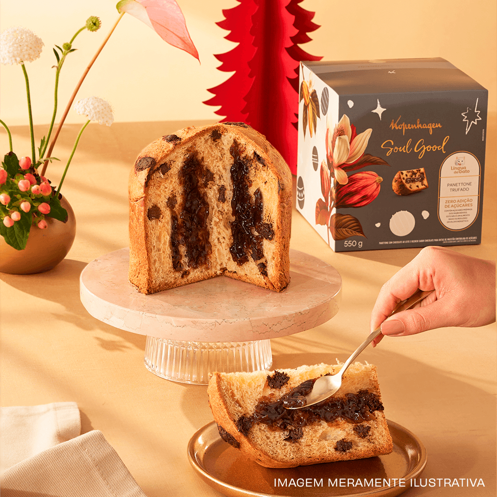 A Kopenhagen traz uma opção zero açúcar. O Panetone Língua de Gato Soul Good é ideal para quem quer aproveitar o melhor do Natal sem adição de açucares. Uma massa macia com gotas e recheio sabor chocolate, 550g. Outro destaque é panettone massa branca com pedaços de pistache, recheio cremoso sabor doce de leite com pistache e uma cobertura de chocolate ao leite e decorado com riscas de chocolate amargo.