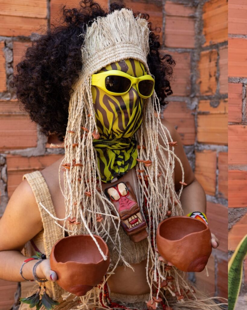 No dia 26, quarta, às 10h, na Feira do Panamericano, Beethoven Cavalcante apresenta “Tramando Memórias”, performance instalativa que cria um espaço de encontro onde público e artista constroem juntos uma trama coletiva com fios, tecidos e técnicas manuais como bordado, macramê e crochê. A ação ativa memórias afetivas e familiares, propondo escuta, partilha e criação artesanal no espaço urbano. Às 16h, na Praça José de Alencar, Severo realiza “Tira o pé pra varrer o chão”, performance itinerante que percorre a cidade com piaçabas, vestido florido e máscara evocando Omolu, acionando memórias de trabalho doméstico, ancestralidade e presença cotidiana de mulheres que mantêm o mundo em movimento.