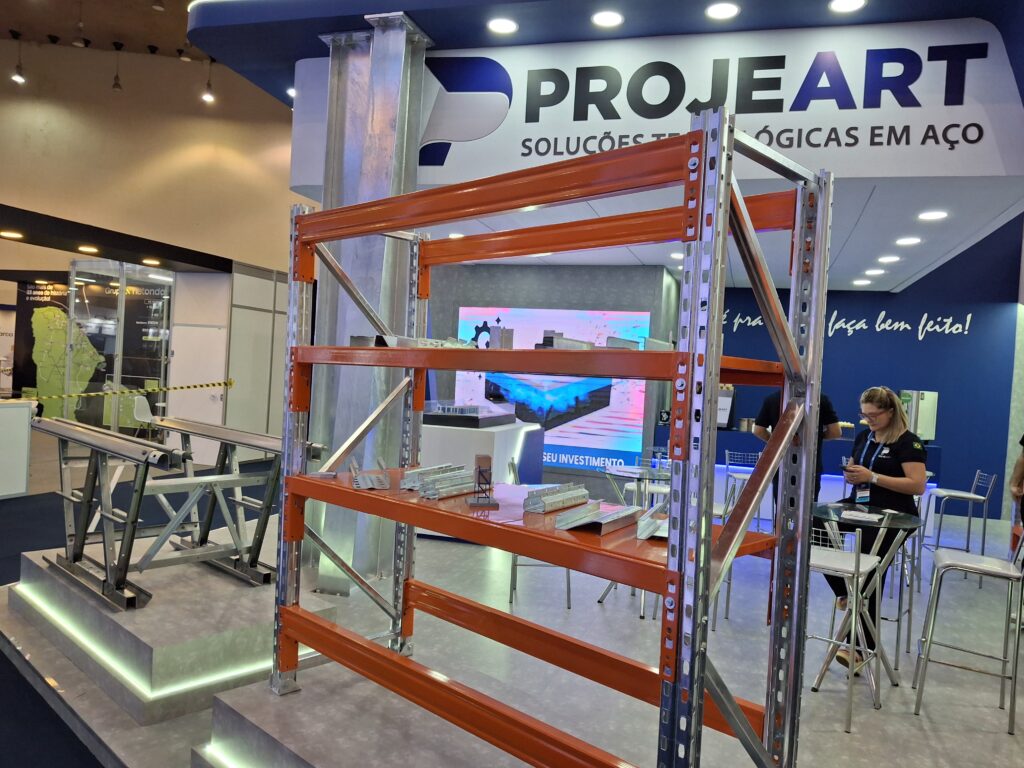 Além do Sistema de Armazenagem, a Projeart trouxe para o estande de 85 m² na Feira da Indústria da FIEC outros produtos e serviços: a Central de Serviços Projeart, responsável pela comercialização de soluções em aço como perfis, terças e telhas; o Projoist, sistema estrutural de vigas formadas a frio, desenvolvido com engenharia própria, alta precisão industrial e foco em grandes vãos e eficiência construtiva; e a Linha de galvanização a fogo, com a exibição de um pilar galvanizado de 1 tonelada, em tamanho real, produzido na planta industrial da empresa.