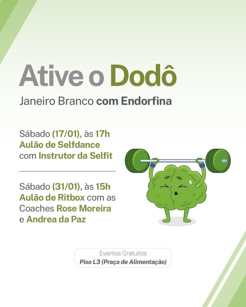 Por fim, no sábado (31) será realizada a ação “Janeiro branco com Endorfina Dodó” às 15h no Piso L3 (praça de alimentação), com foco em um aulão de ritbox com as Coaches Rose Moreira e Andrea da Paz, dando destaque ao hormônio “Endorfina Dodô” relacionada ao bem-estar.
